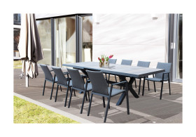 • La struttura è in alluminio verniciato a polvere epossidica il piano è in gres porcellanato grigio tortora effetto legno.