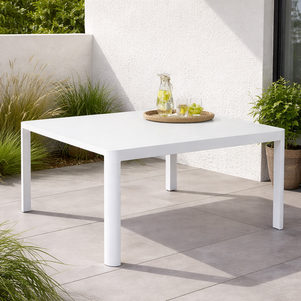 Il colore bianco dona luminosità ed eleganza al tavolo, rendendolo facilmente abbinabile a vari stili di arredo outdoor, dal moderno al minimal.