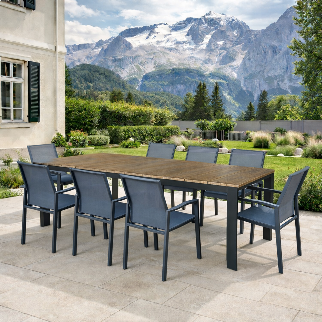 Il tavolo da giardino SACRAMENTO LEGNO MAXI 215 allungabile è pensato per chi desidera un arredo outdoor ampio, moderno e di forte impatto estetico, capace di unire la praticità dei materiali contemporanei al calore visivo del legno. La struttura in alluminio verniciato antracite abbinata al piano con doghe effetto legno crea un contrasto elegante e attuale, ideale per giardini, terrazze e porticati dallo stile moderno.