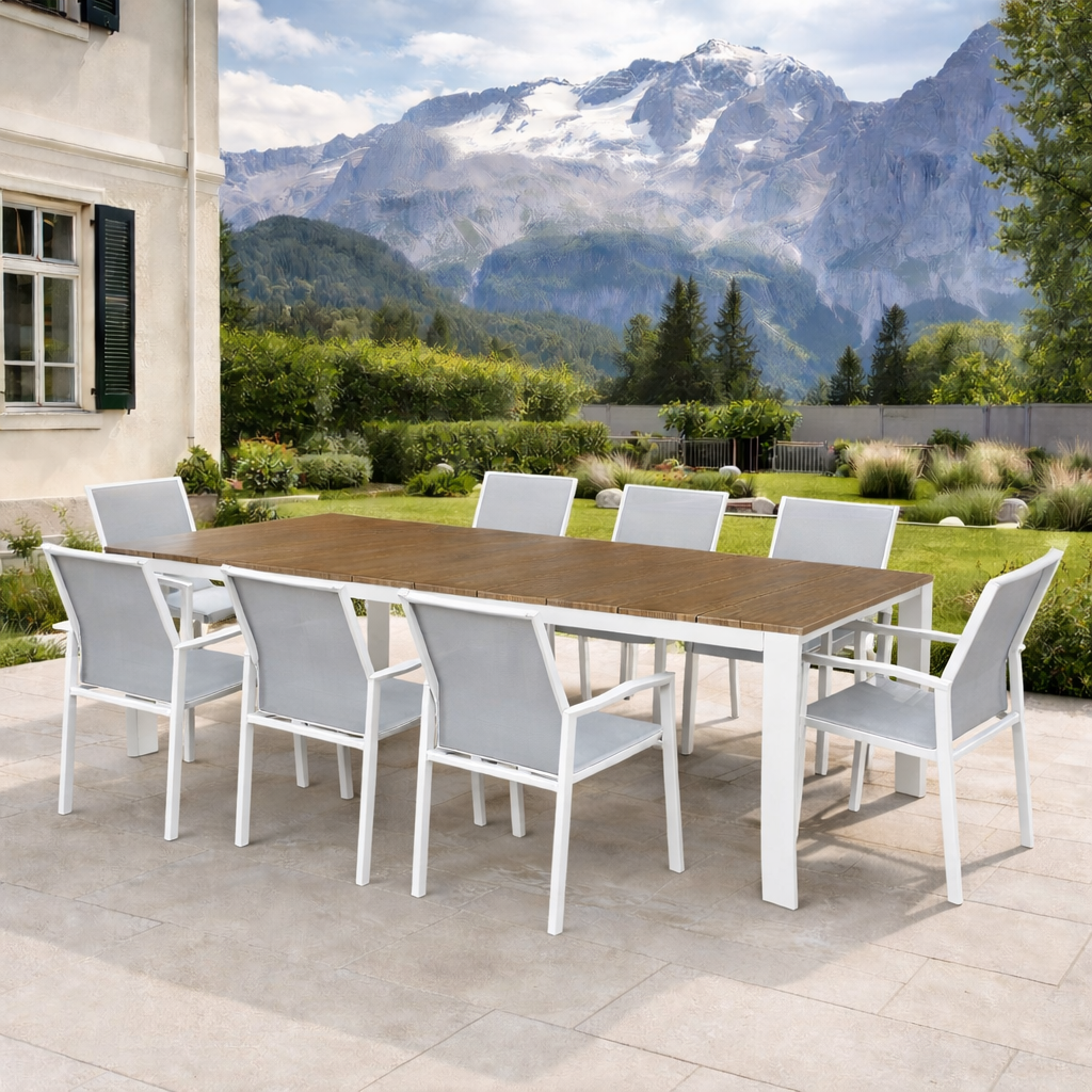 Il tavolo da giardino SACRAMENTO LEGNO MAXI 215 allungabile è la soluzione ideale per chi desidera un arredo outdoor ampio, elegante e altamente funzionale, capace di coniugare l’estetica calda del legno con la praticità dei materiali moderni. La struttura in alluminio verniciato bianco e il piano con doghe effetto legno donano al tavolo uno stile luminoso e contemporaneo, perfetto per giardini, terrazze e porticati.