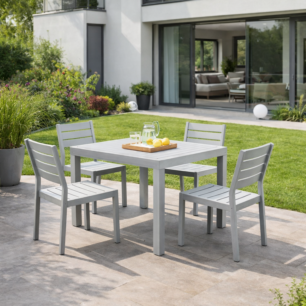 Il tavolo è realizzato interamente in alluminio verniciato a polvere, un materiale leggero ma altamente resistente, studiato per garantire ottime prestazioni negli ambienti esterni.