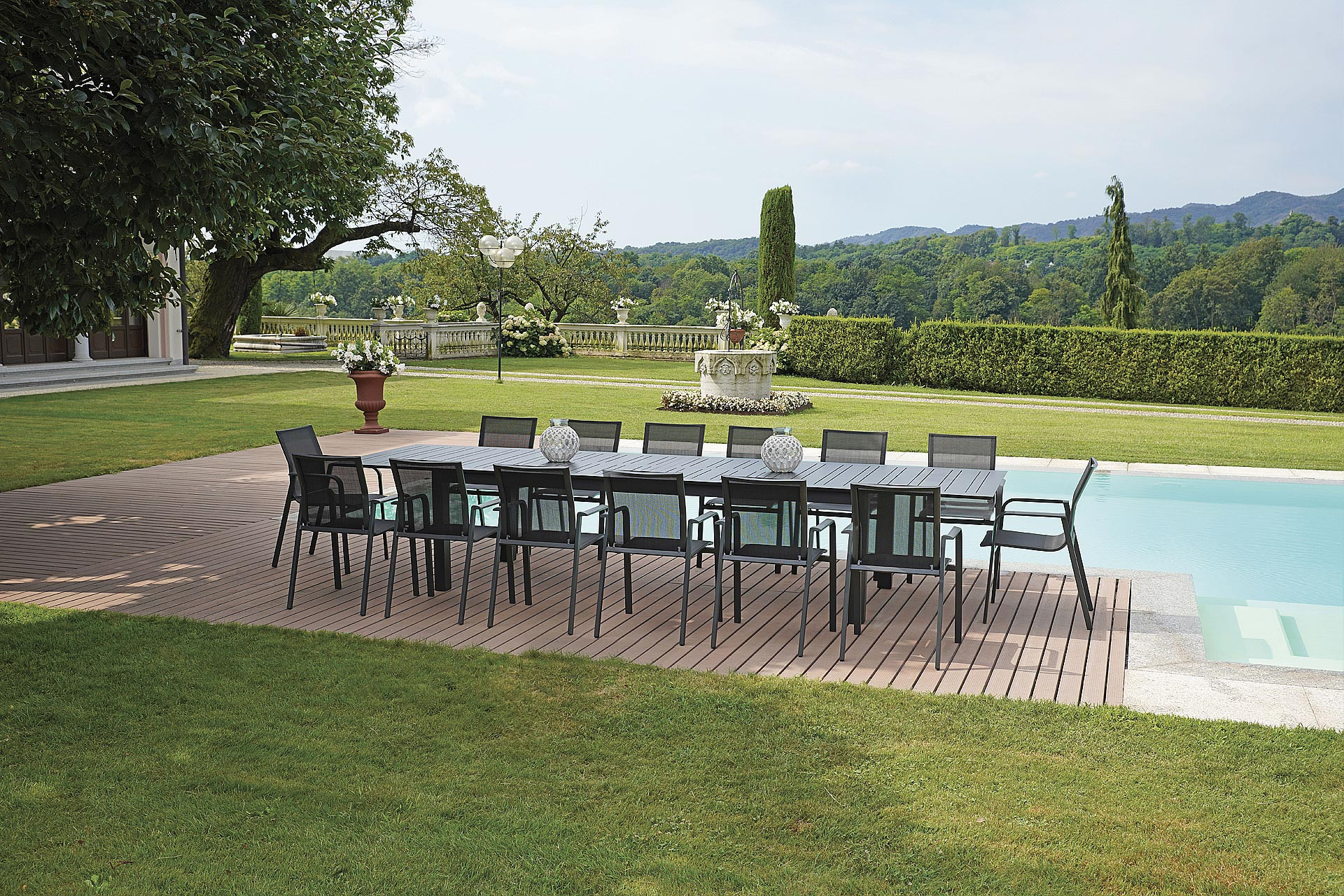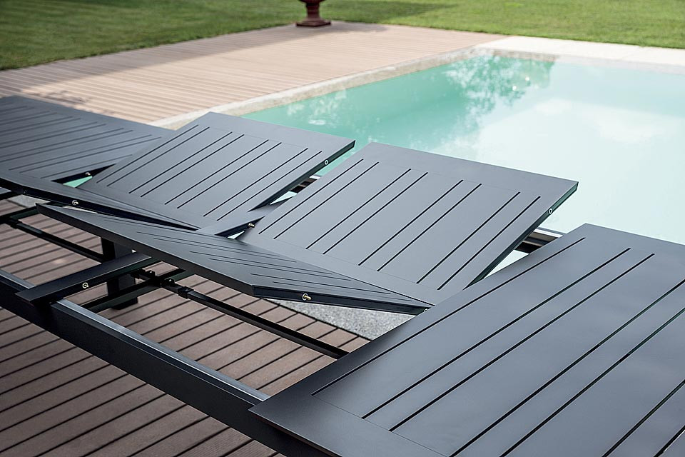 La struttura e il piano sono realizzati interamente in alluminio verniciato antracite, materiale particolarmente indicato per l’esterno grazie a: