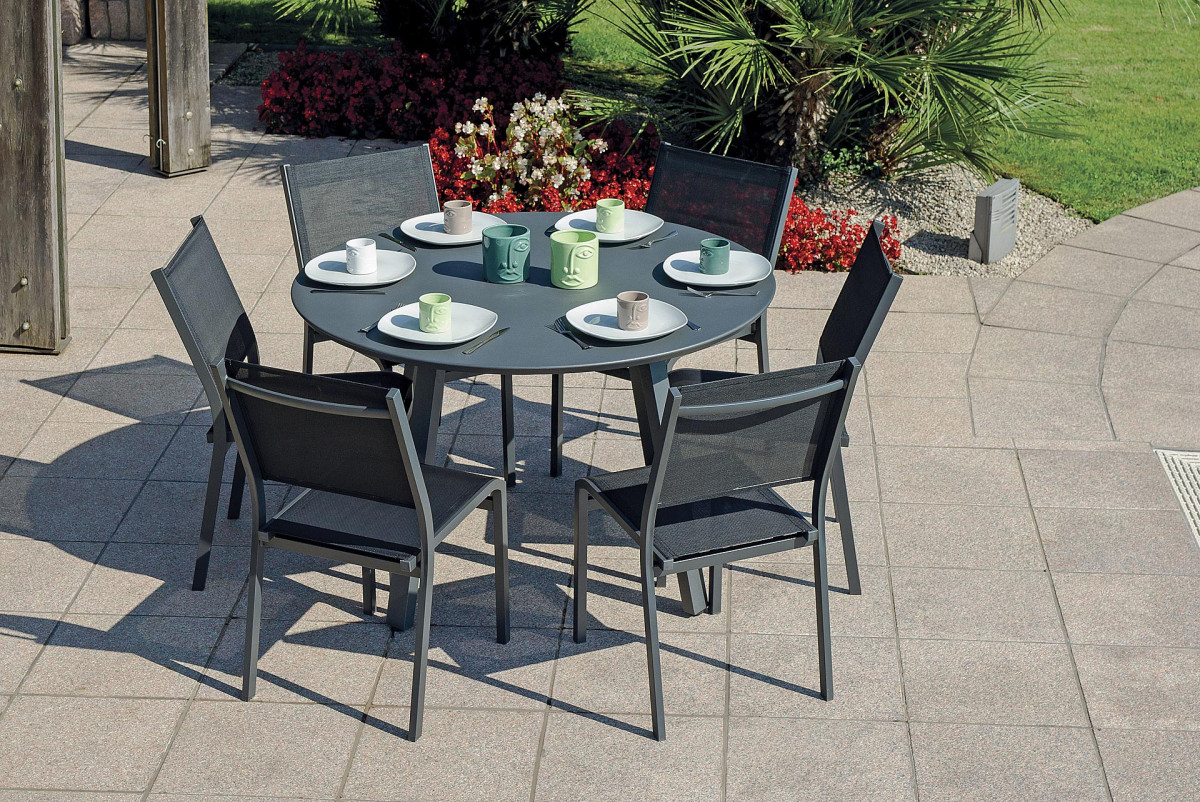 Il diametro di 120 cm offre uno spazio ampio e confortevole, adatto a ospitare comodamente più persone, mentre la finitura antracite conferisce un aspetto moderno e versatile, facilmente abbinabile a sedie in alluminio, legno o materiali tecnici.
