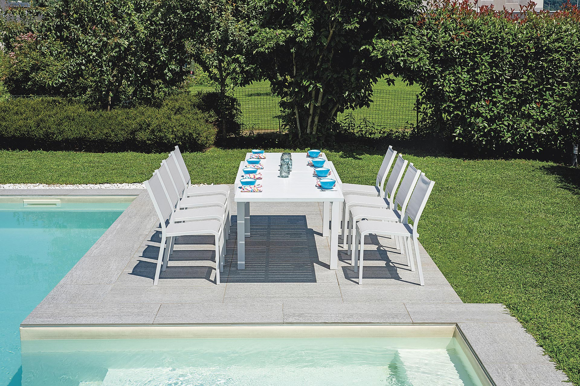 Con una lunghezza regolabile da 135 cm a 270 cm, il tavolo Montecatini è in grado di ospitare fino a 12 persone, rendendolo perfetto sia per l’uso quotidiano che per occasioni speciali. Il design rettangolare dalle linee pulite e decise si abbina perfettamente a sedute da esterno come le sedie Tenerife, creando un ambiente armonioso ed elegante.
