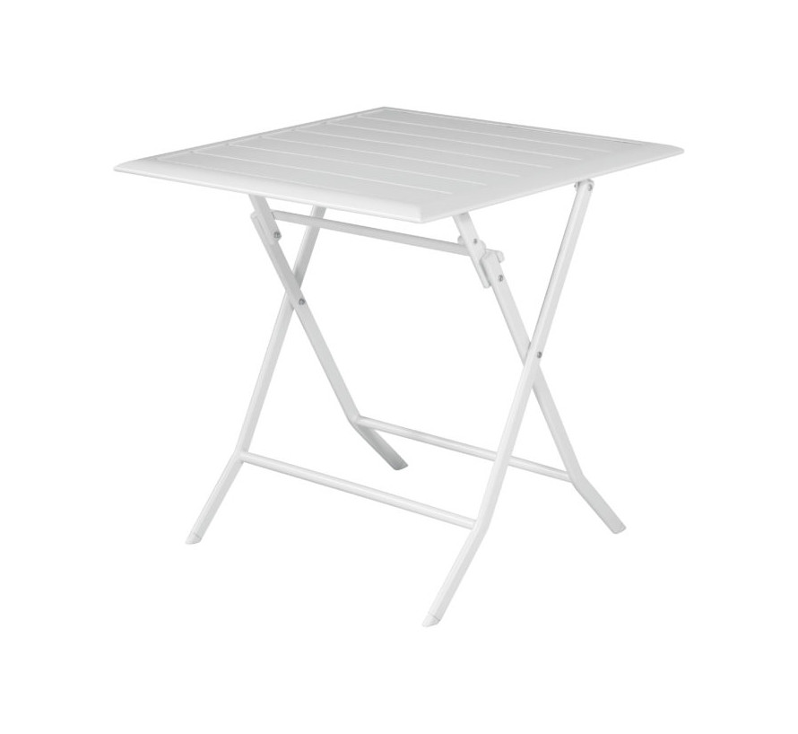 Il piano con doghe in alluminio assicura solidità e facilità di manutenzione, mentre la finitura bianca conferisce un aspetto pulito e moderno, facilmente abbinabile a diverse tipologie di sedute. La funzione pieghevole consente di richiudere il tavolo rapidamente, facilitando il rimessaggio e ottimizzando lo spazio quando non in uso.