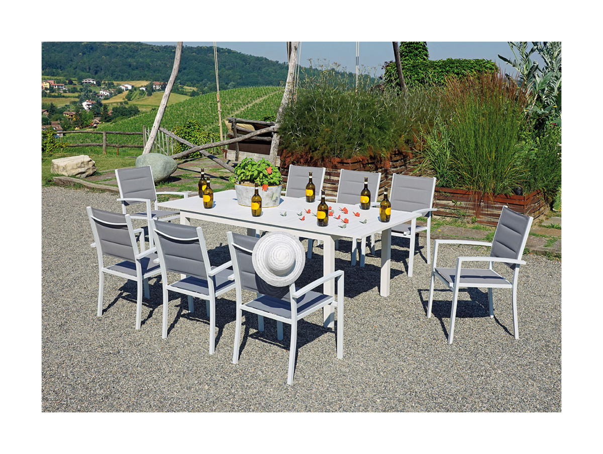 San Gimignano è il tavolo da giardino allungabile firmato Greenwood, realizzato in alluminio proposto nella colorazione del bianco. Luminoso e versatile, presenta una struttura a 4 gambe a sezione quadrata ed un top dogato con cornice perimetrale, discreto e leggero!