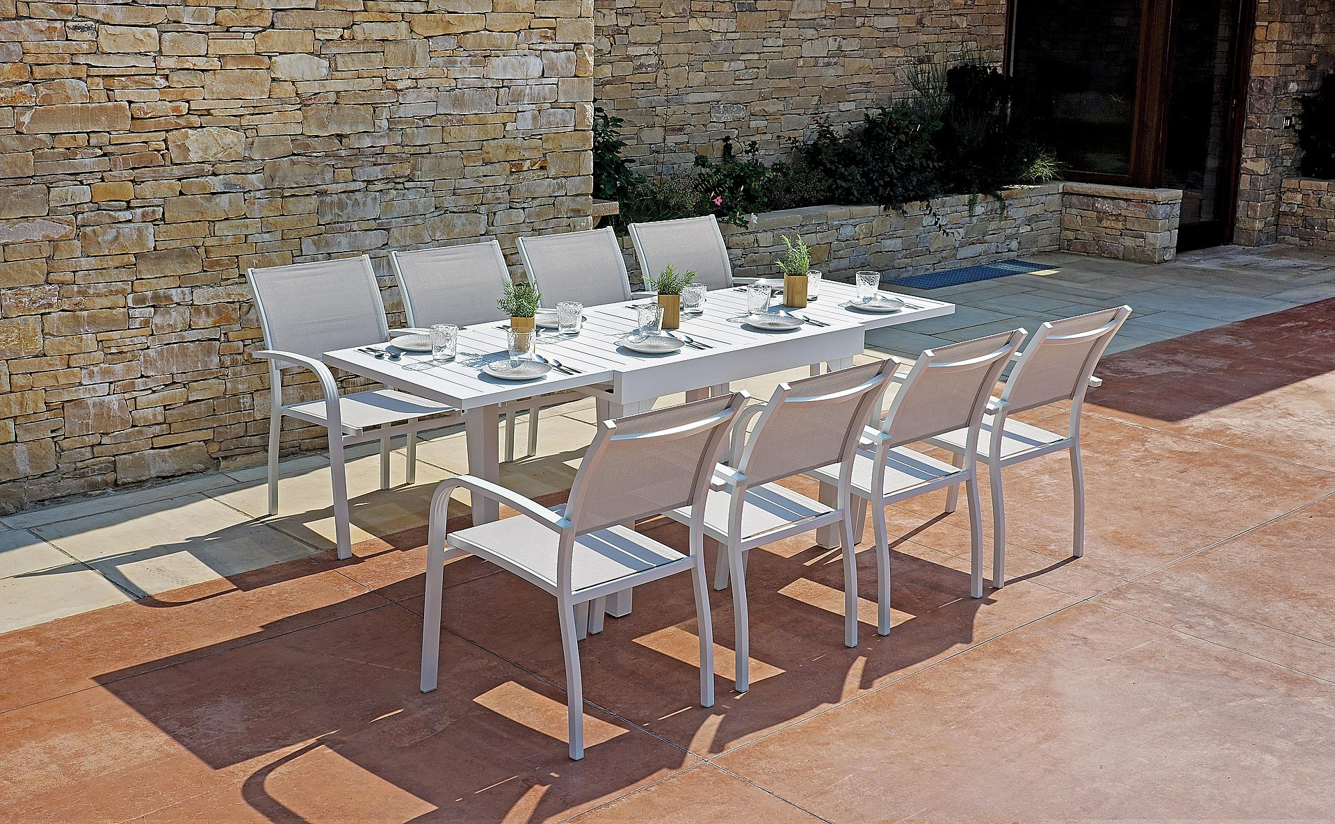 Il tavolo è realizzato in alluminio verniciato bianco, una finitura luminosa e contemporanea che si integra facilmente in qualsiasi contesto outdoor. La struttura a quattro gambe a sezione quadrata assicura stabilità e solidità, mentre il piano a doghe in alluminio con cornice perimetrale conferisce un aspetto pulito, discreto e leggero.