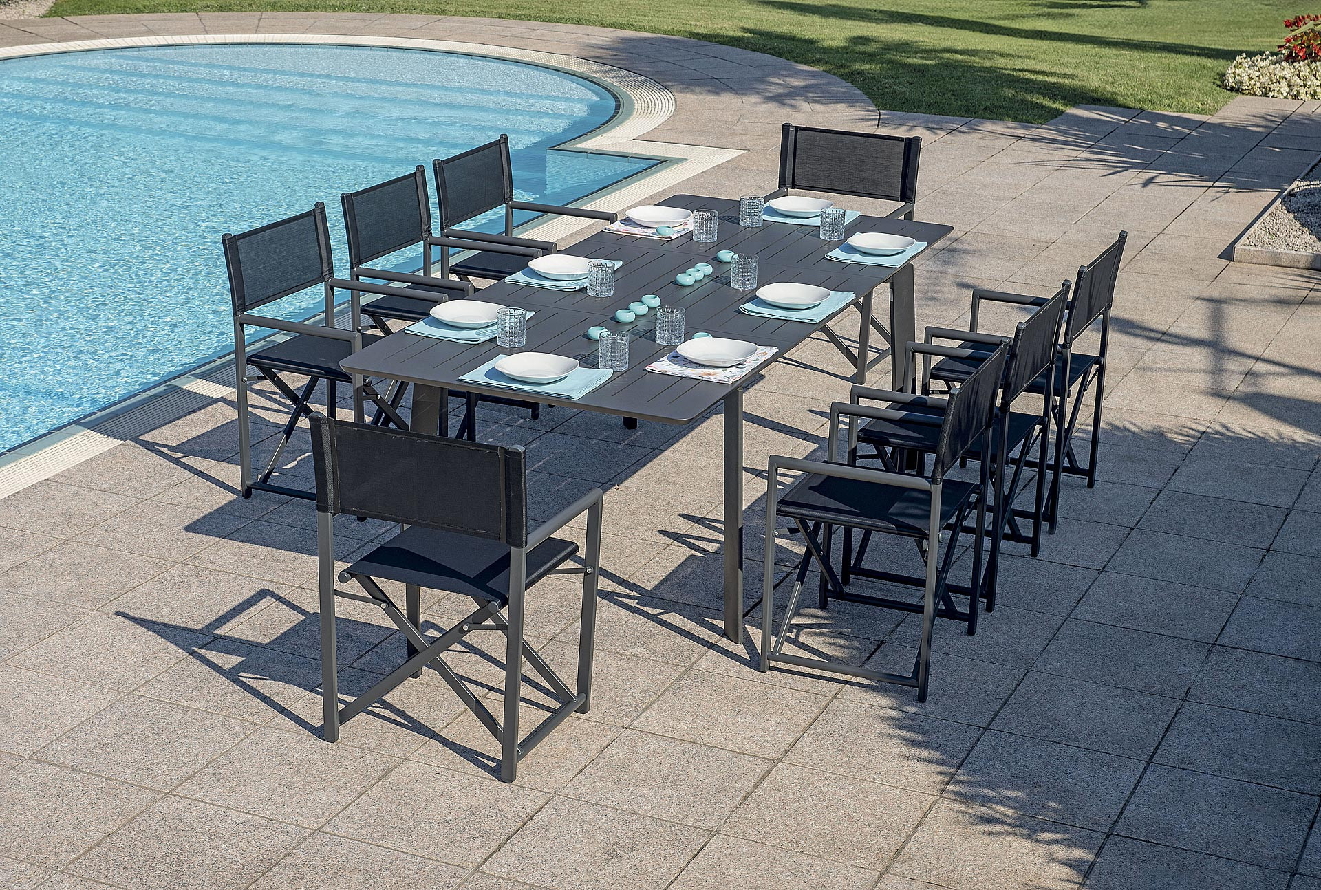 Può essere completato con sedie coordinate in alluminio per creare un set armonioso e funzionale.