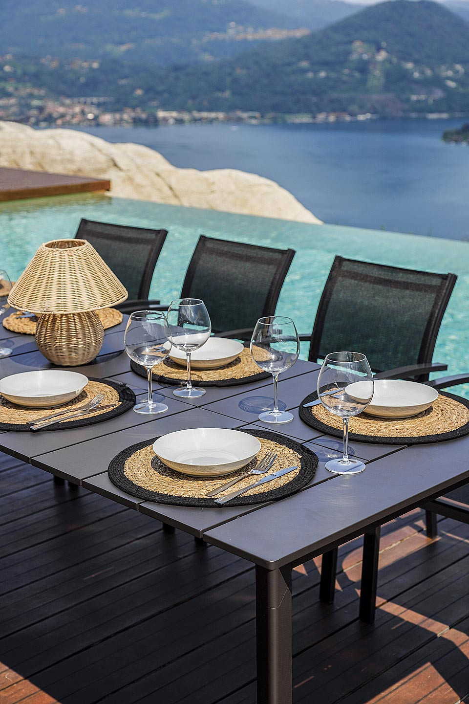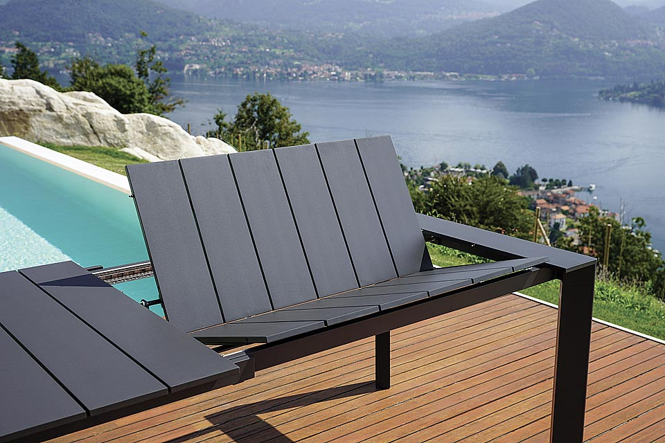 La struttura è realizzata interamente in alluminio verniciato color antracite, materiale resistente agli agenti atmosferici, alla corrosione e perfetto per l’utilizzo continuativo all’aperto. Il piano a doghe in alluminio conferisce un aspetto contemporaneo e ordinato, oltre a garantire praticità e facilità di pulizia.