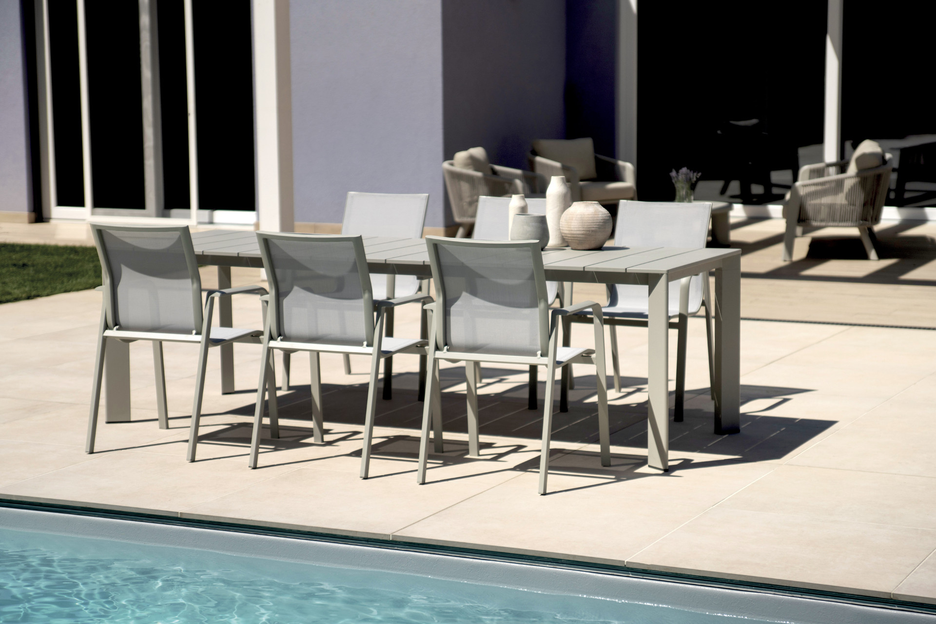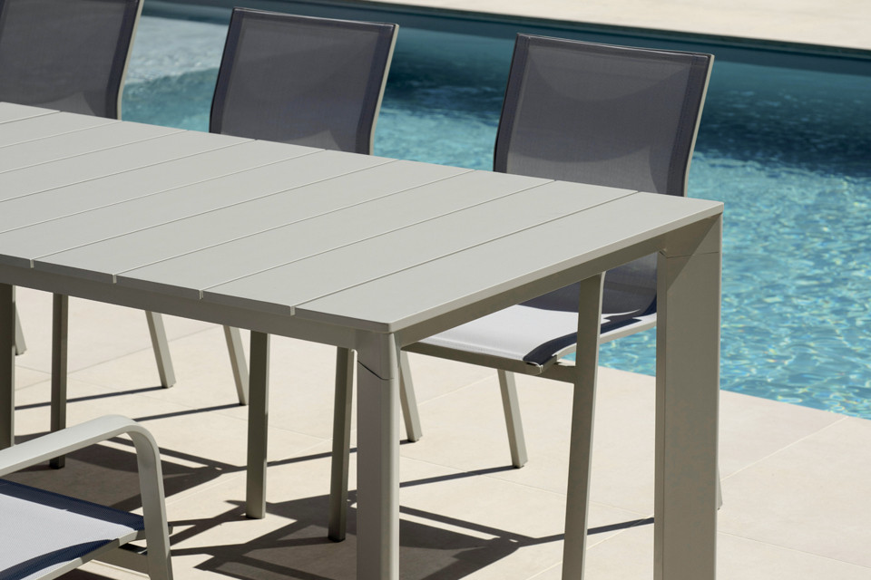 La struttura è realizzata interamente in alluminio verniciato color creta, una finitura elegante e contemporanea che si integra armoniosamente in contesti naturali, mediterranei e moderni. L’alluminio garantisce resistenza agli agenti atmosferici, alla corrosione e all’usura, rendendo il tavolo ideale per un utilizzo continuativo all’aperto.