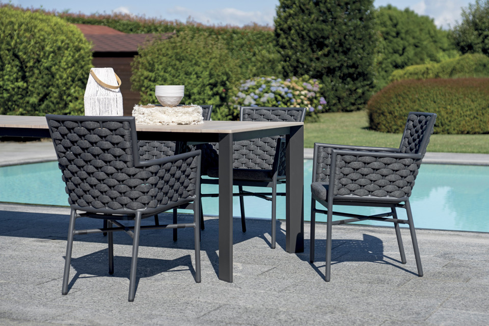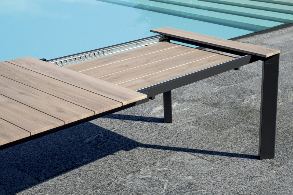 La struttura in alluminio verniciato antracite assicura leggerezza, solidità e un’elevata resistenza agli agenti atmosferici e alla corrosione, rendendo il tavolo ideale per un utilizzo esterno continuativo.