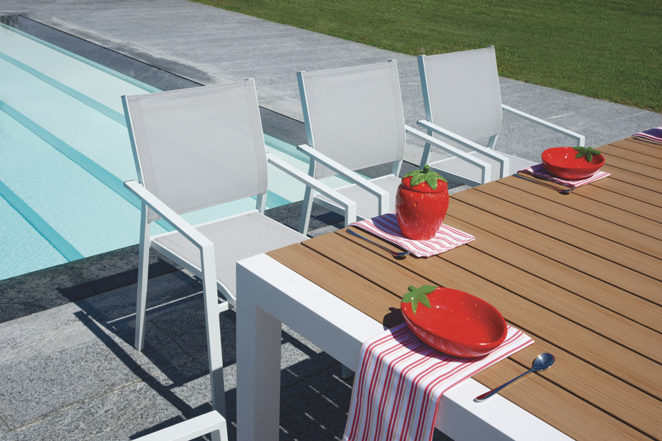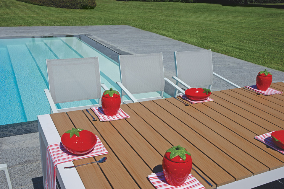 Il piano in Resin Wood riproduce l’estetica naturale del legno, offrendo al contempo prestazioni superiori in termini di resistenza a umidità, raggi UV e sbalzi termici, con una manutenzione estremamente ridotta.