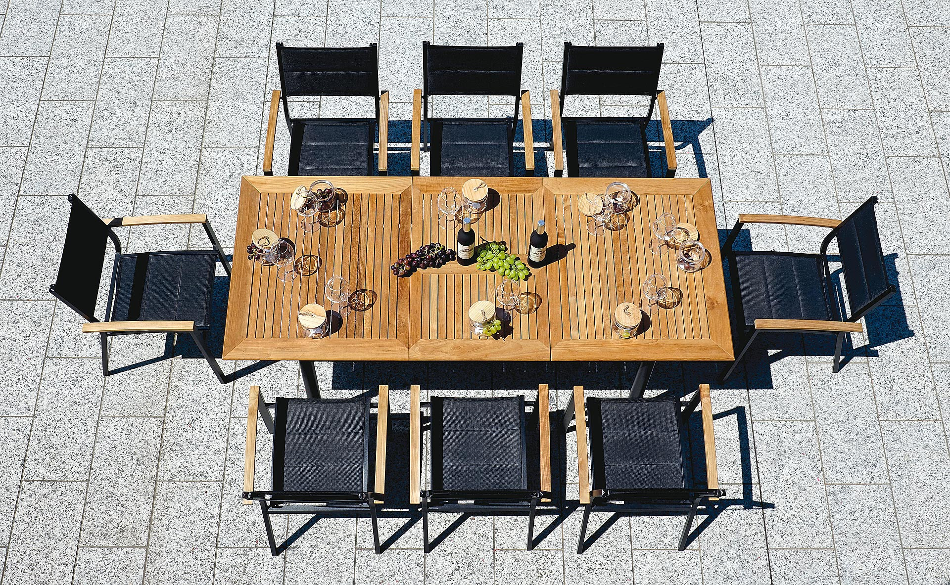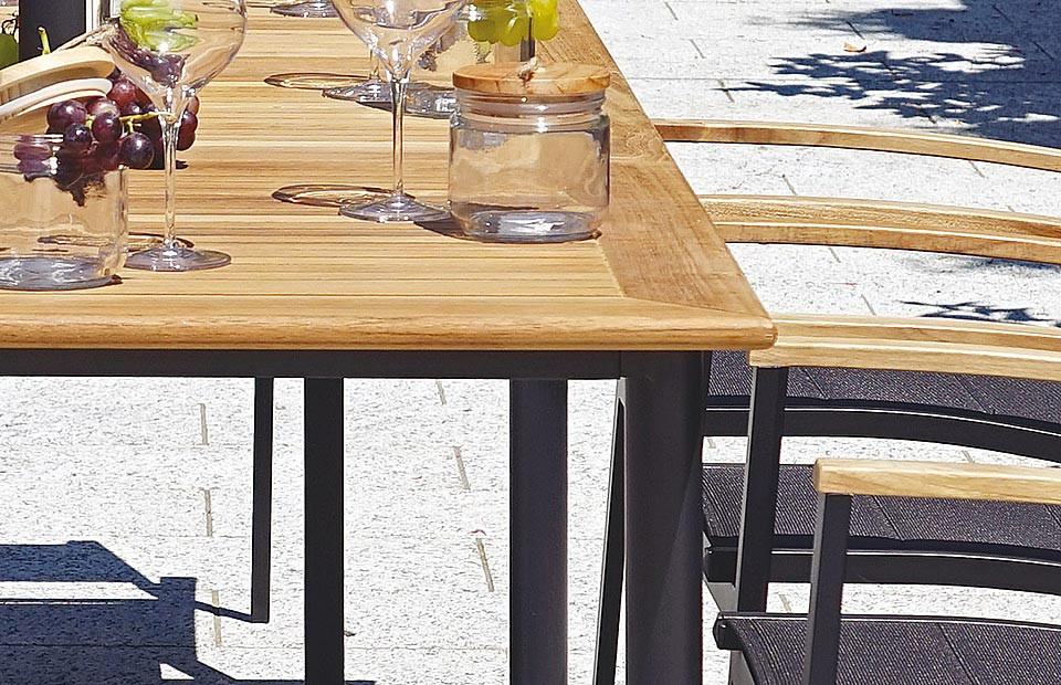 Il piano è realizzato in teak FSC, un legno pregiato apprezzato per la sua eccezionale durabilità e resistenza a sole, pioggia e umidità. La tonalità calda del teak crea un piacevole contrasto con la struttura in alluminio grigio antracite, conferendo al tavolo un aspetto moderno ed elegante.