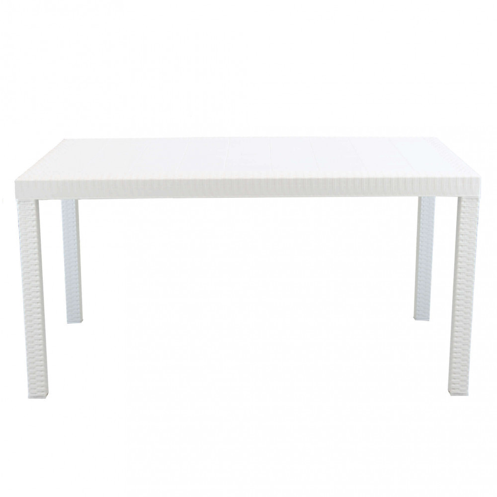 Il tavolo è realizzato con struttura in plastica stampata effetto wicker color bianco, materiale resistente e adatto all’utilizzo esterno. La finitura intrecciata richiama l’estetica del wicker tradizionale, conferendo un aspetto elegante e curato, unito alla praticità della plastica, facile da pulire e mantenere.