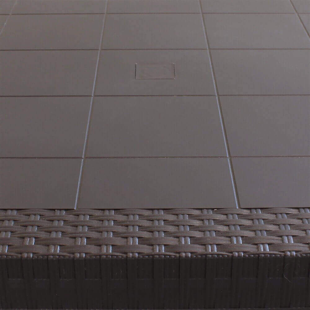 Il tavolo è realizzato con struttura in plastica stampata effetto wicker color marrone, materiale resistente e adatto all’utilizzo esterno. La finitura intrecciata richiama l’estetica del wicker tradizionale, conferendo un aspetto elegante e curato, unito alla praticità della plastica, facile da pulire e mantenere.
