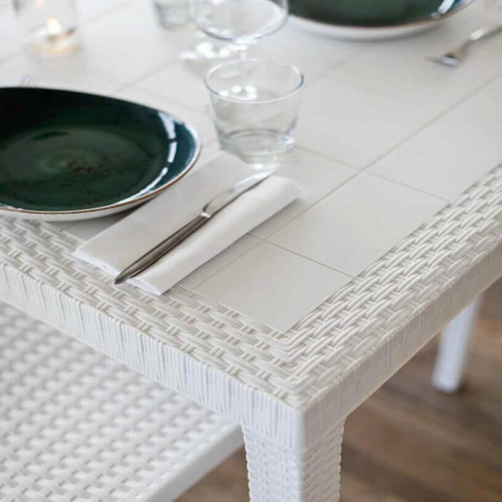 Il tavolo è realizzato con struttura in plastica stampata effetto wicker color bianco, materiale resistente e adatto all’utilizzo esterno. La finitura intrecciata richiama l’estetica del wicker tradizionale, donando un aspetto elegante e curato, unito alla praticità della plastica, facile da pulire e mantenere.