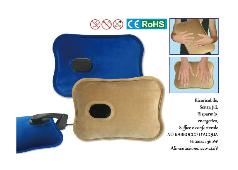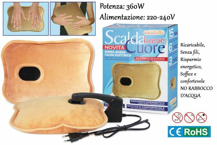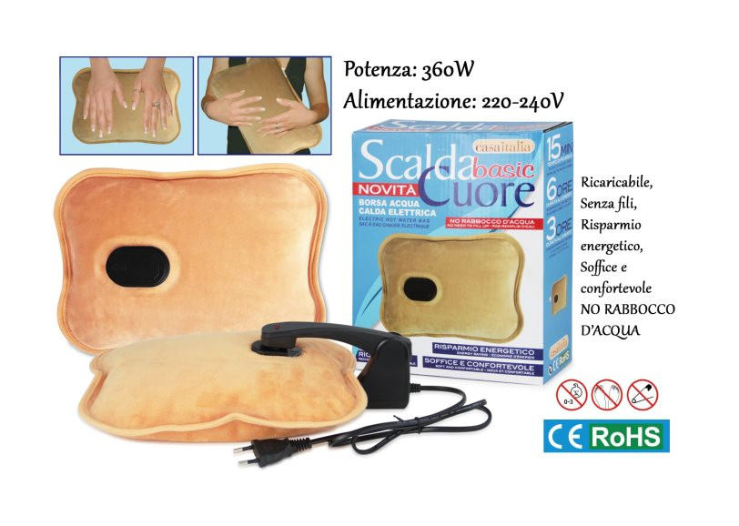 La nuova borsa acqua calda elettrica "SCALDA CUORE BASIC" di colore BEIGE, è stato rinnovato completamente con un nuovo tessuto esterno in poliestere morbido al tatto, tre strati di pvc interno, bordo rinforzato termosaldato e cucito, nuova tecnologia di riscaldamento con resistenza corrazzata e nuovo sistema di sicurezza per connettere "Scalda Cuore Basic" alla rete elettrica (a norma EU). E' inoltre certificata (CE, RoHs). Misura: "L" 26 x "P" 19 cm ed è ideale per donare una gradevole sensazione di calore, ridurre le tensioni e rilassare il corpo. Ha una frequenza di 50 Hz, potenza 360W e con un voltaggio: 220-240 V (utilizzare prese elettriche idonee a questo voltaggio). Si ricarica in soli 10/15 minuti e quando sarà carico, grazie al nuovo sistema tecnologico di spegnimento automatico, il vostro "Scalda Cuore Basic" si spegnerà da solo, e sarà pronto all'uso!