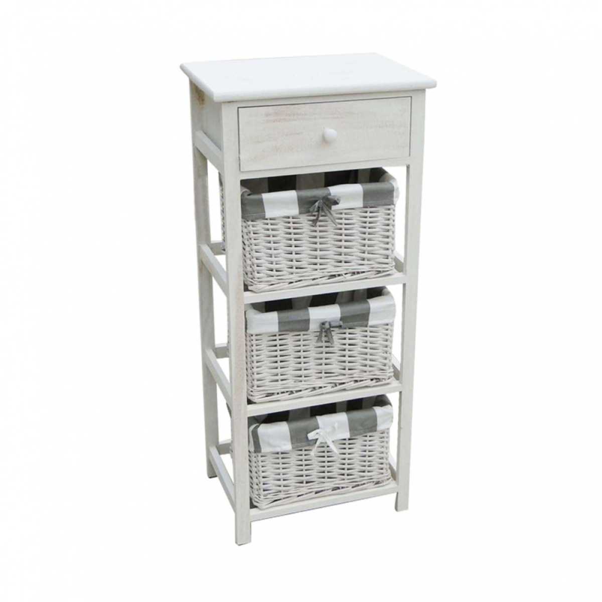 struttura in legno di paulownia bianco 1 cassetto in legno colore bianco, 3 cassetti in salice colore bianco e rivestimento in tessuto rigato dimensioni: cm 40 x 29 x 90 h