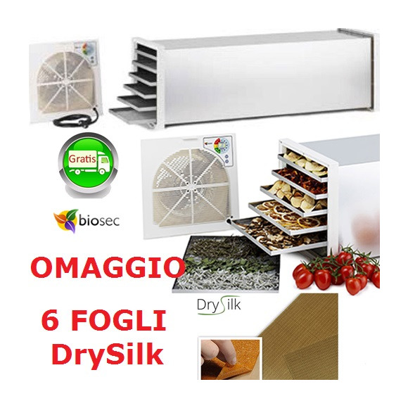 Essiccatore a 6 cestelli Biosec Lusso De Luxe B6 in acciaio inox con Dryset Pro IN OMAGGIO N.6 DRY SILK IL COMODO FOGLIO ANTIADERENTE, LAVABILE E RIUTILIZZABILE. Descrizione: