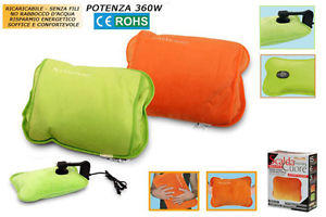 Questa nuova borsa acqua calda elettrica, ScaldaCuore Luxury VERDE è stata rinnovata completamente, con la nuova normativa sulla sicurezza. Grazie a studi e a certificazioni la nuova borsa dell'acqua calda elettrica, ha una nuova tecnologia di riscaldamento con resistenza corazzata e in più un nuovo sistema per connetterlo alla rete elettrica, inoltre è certificato (CE, RoHs e SGS). Perché 2 in 1? Oltre ad essere usata come borsa acqua calda elettrica, lo potrete usare anche come scaldamani, grazie alla tasca posta nella parte frontale. Misura: 30 x 21 cm ed è ideale per donare una gradevole sensazione di calore, ridurre le tensioni e rilassare il corpo. E' utile anche nell' alleviare mal di stomaco, indigestioni e scalda perfettamente pancia, mani e piedi. Si ricarica in soli 10/15 minuti e quando sarà carico, grazie al nuovo sistema tecnologico di spegnimento automatico, il vostro coccolo si spegnerà da solo, e sarà pronto all' uso!Informazioni Tecniche Senza fili Colore grigio Frequenza: 50 Hz Potenza: 360 W Forma rettangolare Risparmio energetico In carica spia accesa Finito la ricarica spia spenta Morbida e confortevole al tatto Non necessita di cambio dell'acqua Si usa senza cavo di alimentazione Ricaricabile tramite caricatore elettronico 10/15 minuti in carica e sarà pronto all' uso! Sistema tecnologico di spegnimento automatico Mantiene la temperatura da 4 a 6 ore, garantite! Composizione del rivestimento interno: 100% PVC Composizione del rivestimento esterno: 100% poliestere Il liquido all'interno della borsa è composto da acqua e cloruro di sodio Voltaggio: 220-240 V (Utilizzare prese elettriche idonee a questo voltaggio) Misure 30 x 21 cm