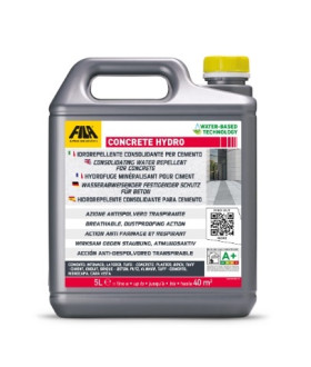 CONCRETE HYDRO è un impermeabilizzante trasparente a base acqua con azione idrorepellente e consolidante, studiato per la protezione di superfici in cemento e materiali assorbenti. Penetra in profondità, rafforza il supporto e lo protegge dagli agenti atmosferici, senza alterarne l’aspetto estetico.
