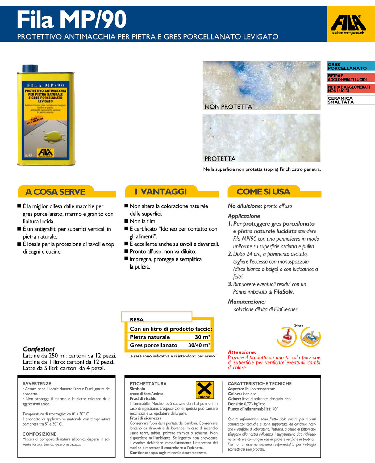 FILA MP/90 è un protettivo antimacchia trasparente per pietra naturale, marmo, granito, agglomerati, gres porcellanato levigato.