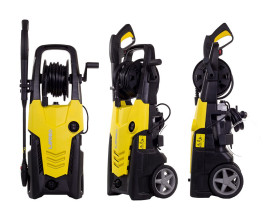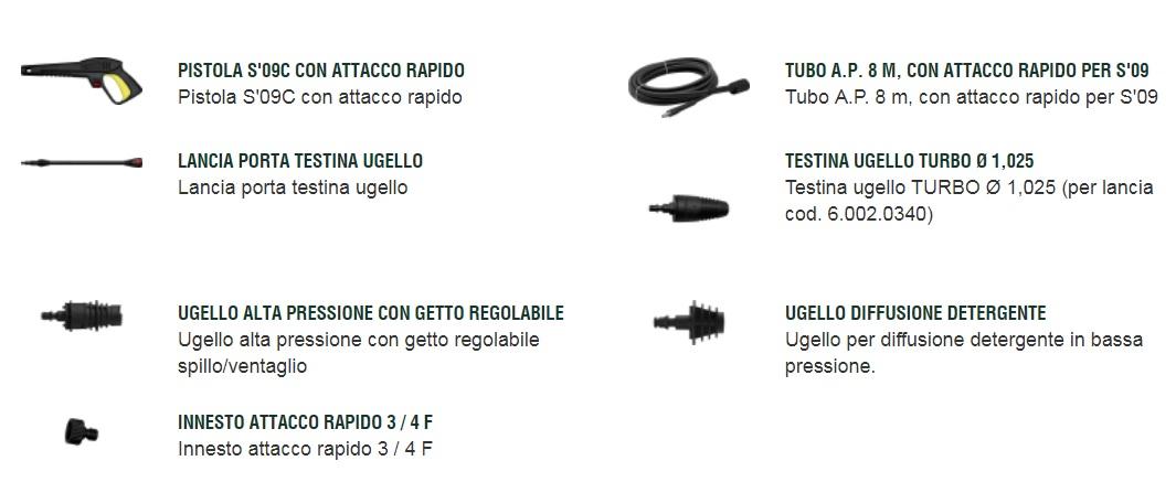? Gruppo pompa assiale, testata in alluminio a tre pistoni in acciaio ad alta resistenza con valvola by-pass incorporata. ? Motore ad induzione da 2200W.? Carrello con manico ergonomico ? Vano portaccessori. ? Avvolgitubo. ? Aspirazione detergente diretta con serbatoio incorporato. ? AUTOMATIC STOP SYSTEM, che consente l?attivazione o stop totale della macchina azionando la leva della pistola. ? Lancia con doppio ugello ? Pistola con attacco rapido.