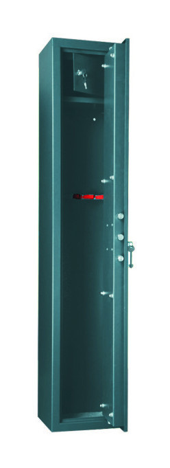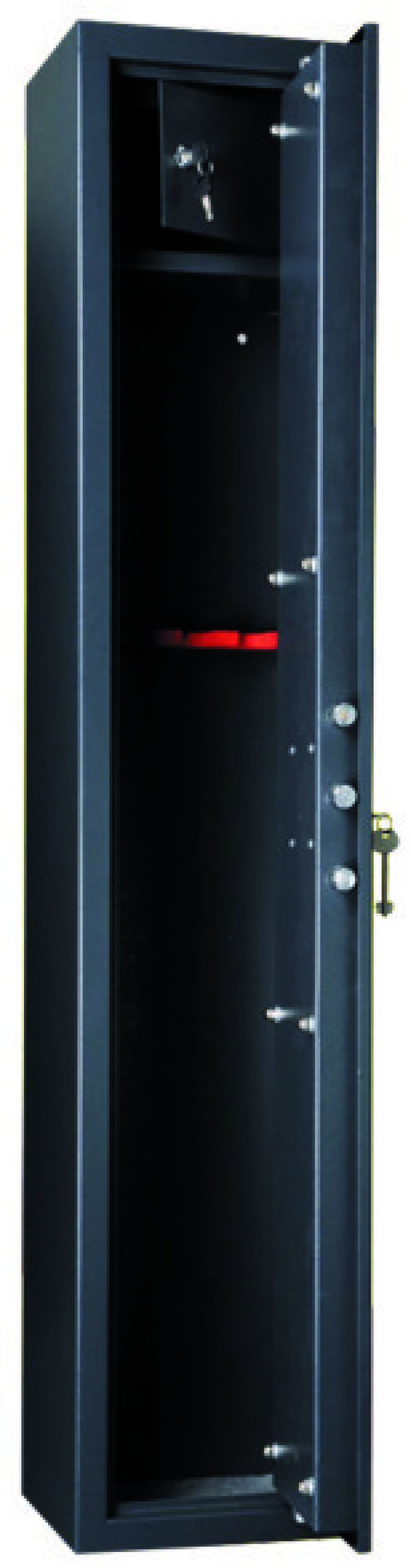 Struttura in acciaio speciale - Sostegni per canna di fucile - Fori di ancoraggio a muro o a pavimento (4+2) - Fornito con rastrelliera a 5 posti - Tesoretto interno a chiave - Spessore porta 3 mm.