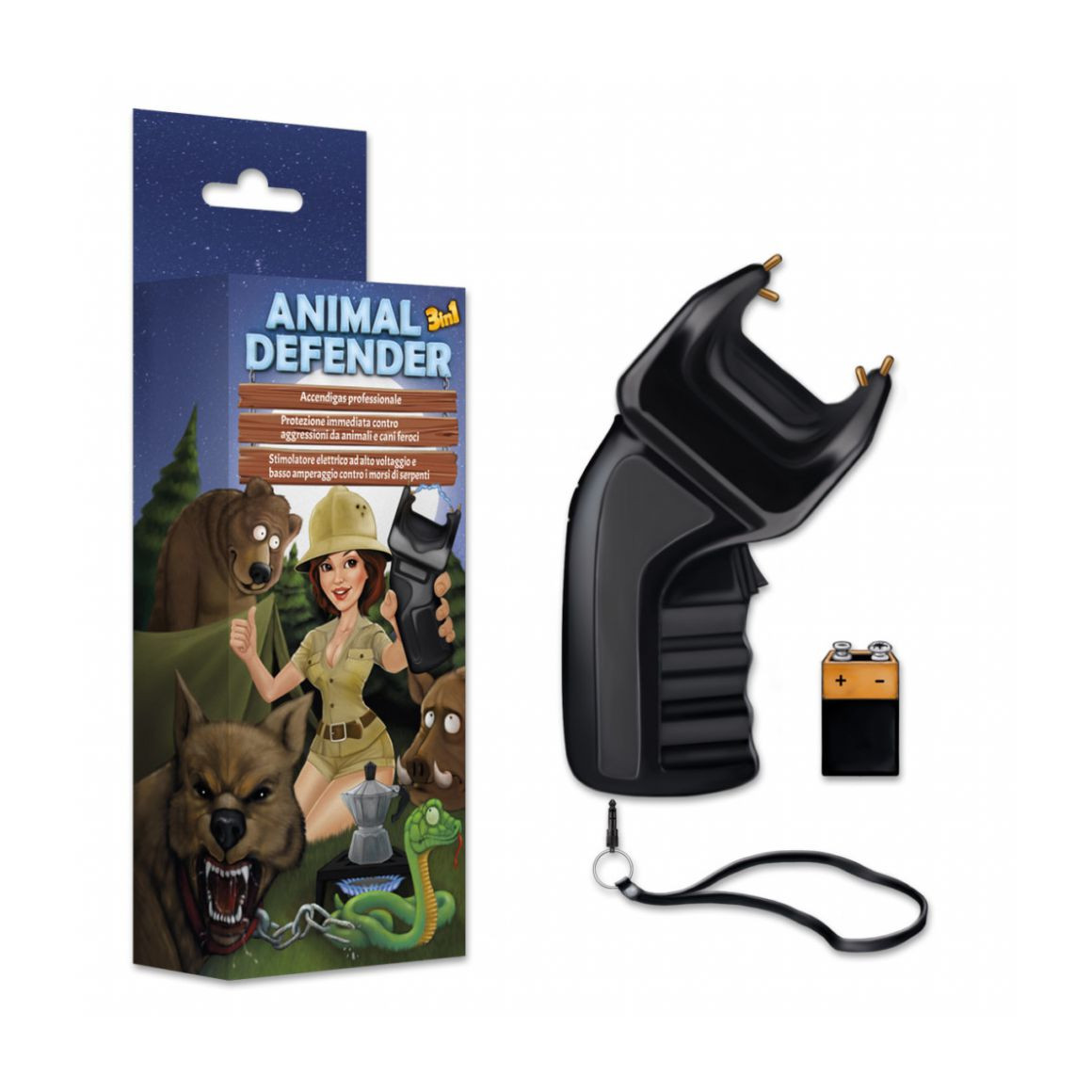 Dissuasore elettrico Animal Defender 3 in 1 (a norma CE) con scarica di corrente da 180.000 volt multifunzionale. La scocca esterna del dissuasore e in ABS anti scarica e anti urto e gli elettrodi sono in lega metallica. Oggetto multi-funzione oltre alla difesa personale può essere utilizzato per: