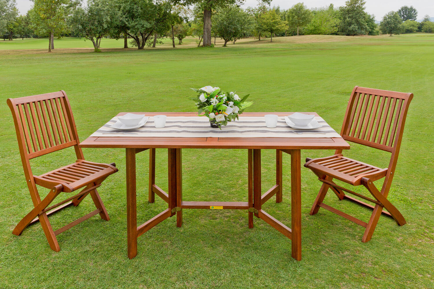 Il tavolo Papavero può essere completato con sedie pieghevoli nello stesso legno di keruing.