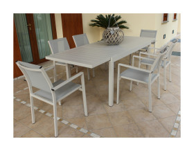 Vorreste invitare in giardino i vostri amici e dare loro il giusto comfort? Questo set è il complemento che fa per voi. La finitura e la scelta del bianco rendono il set neutro e ideale per qualsiasi ambiente esterno arredato con gusto moderno, garantendo al contempo stile e ricercatezza. Il tavolo da pranzo rettangolare da 160 cm allungabile fino a 240cm è realizzato in alluminio TORTORA con piano d'appoggio in alluminio bianco semi-opaco.