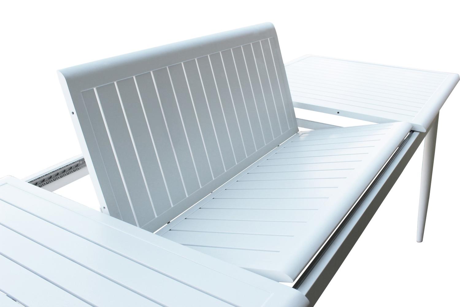 Materiali resistenti come l'alluminio sono alla base di questo tavolo rettangolare da giardino. La struttura, in resistente alluminio colore bianco, sostiene un piano d'appoggio a doghe .