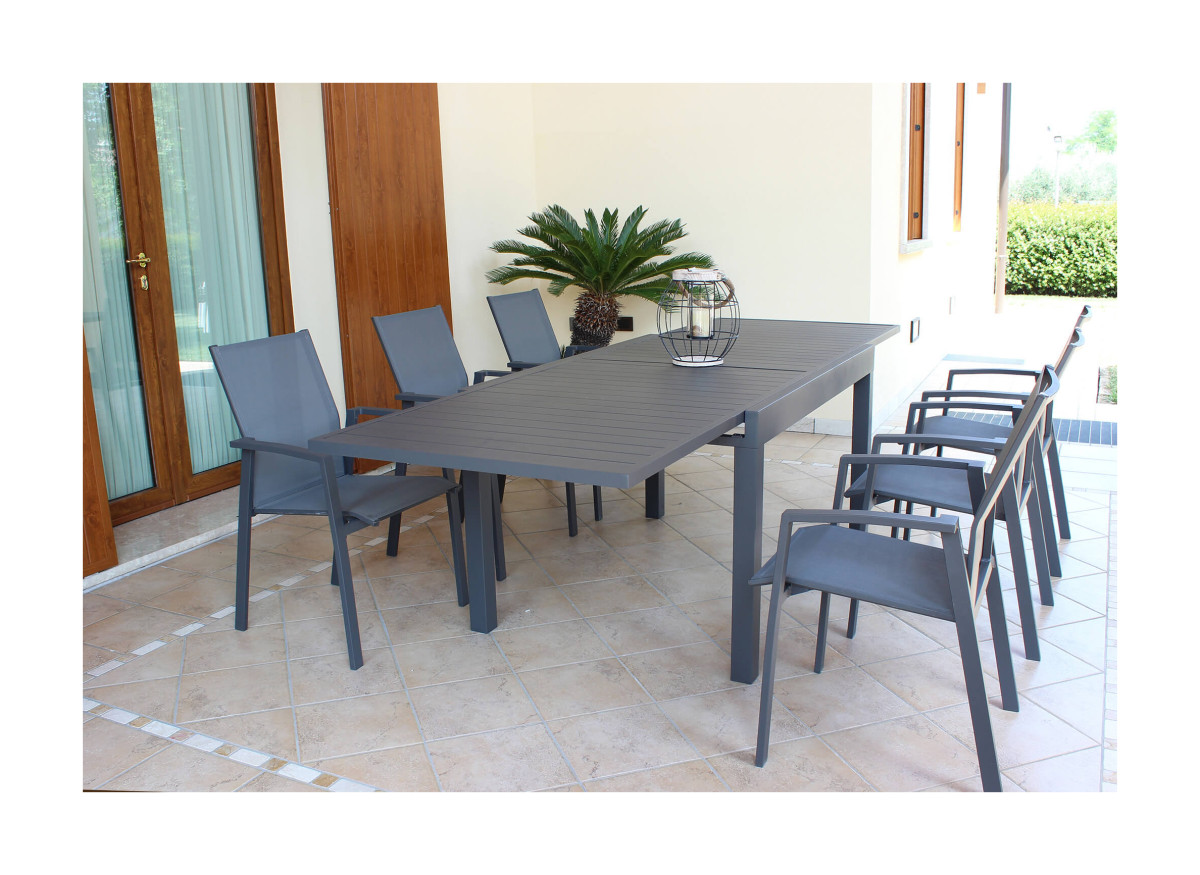 L'alluminio è il materiale ideale per le finiture dei vostri arredi outdoor, resistente agli agenti atmosferici e durevole nel tempo. In famiglia o con gli amici, sarà un piacere rilassarsi nei mesi più caldi grazie al set allungabile acquistabile su fabio.pro
