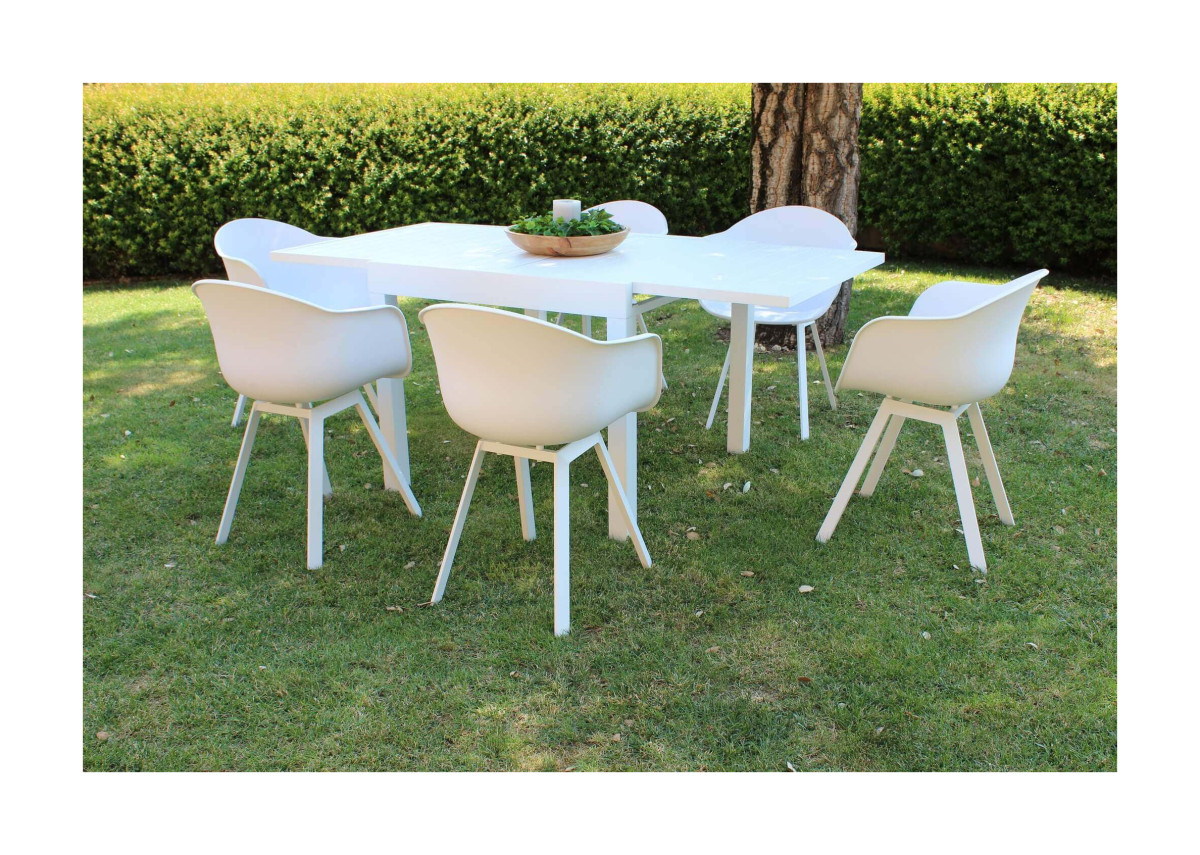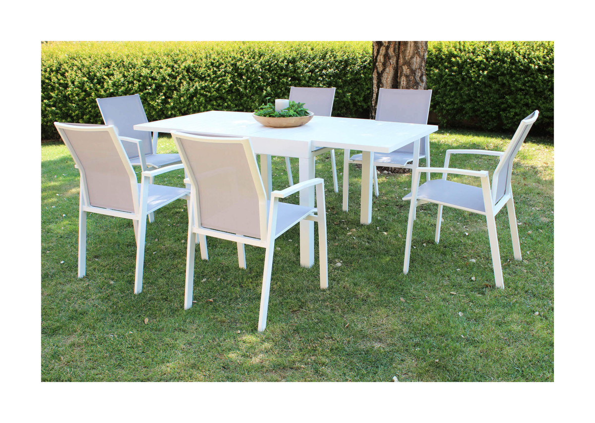 Vorreste invitare in giardino i vostri amici e dare loro il giusto comfort? Questo set è il complemento che fa per voi. La finitura e la scelta del bianco rendono il set neutro e ideale per qualsiasi ambiente esterno arredato con gusto moderno, garantendo al contempo stile e ricercatezza. Il tavolo da pranzo rettangolare da 90 cm allungabile fino a 180 cm è realizzato in alluminio con piano d'appoggio in alluminio semi-opaco.