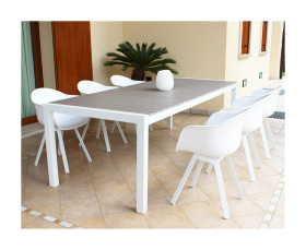 Vorreste invitare in giardino i vostri amici e dare loro il giusto comfort? Questo set è il complemento che fa per voi. La finitura e la scelta del bianco rendono il set neutro e ideale per qualsiasi ambiente esterno arredato con gusto moderno, garantendo al contempo stile e ricercatezza. Il tavolo da pranzo rettangolare da 162 cm allungabile fino a 242 cm è realizzato in alluminio bianco con piano d'appoggio in polywood.