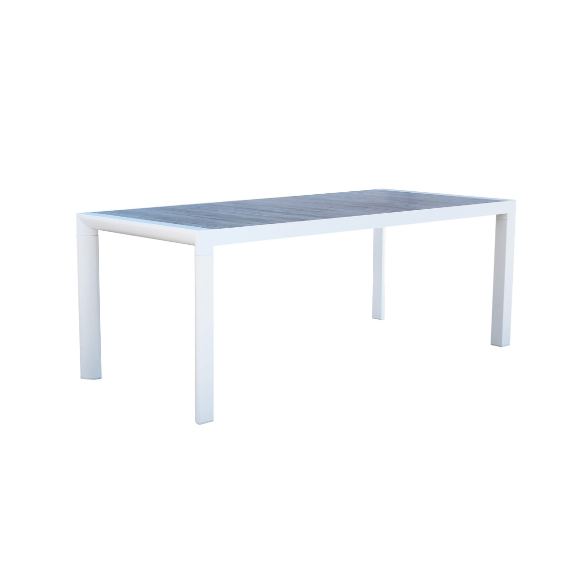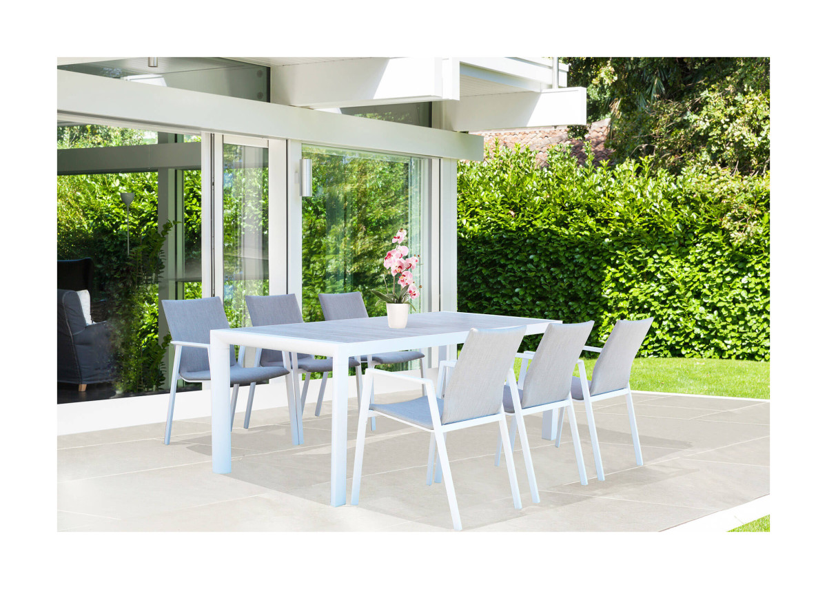 La struttura è realizzata in alluminio verniciato a polvere epossidica, abbinata al top rettangolare in