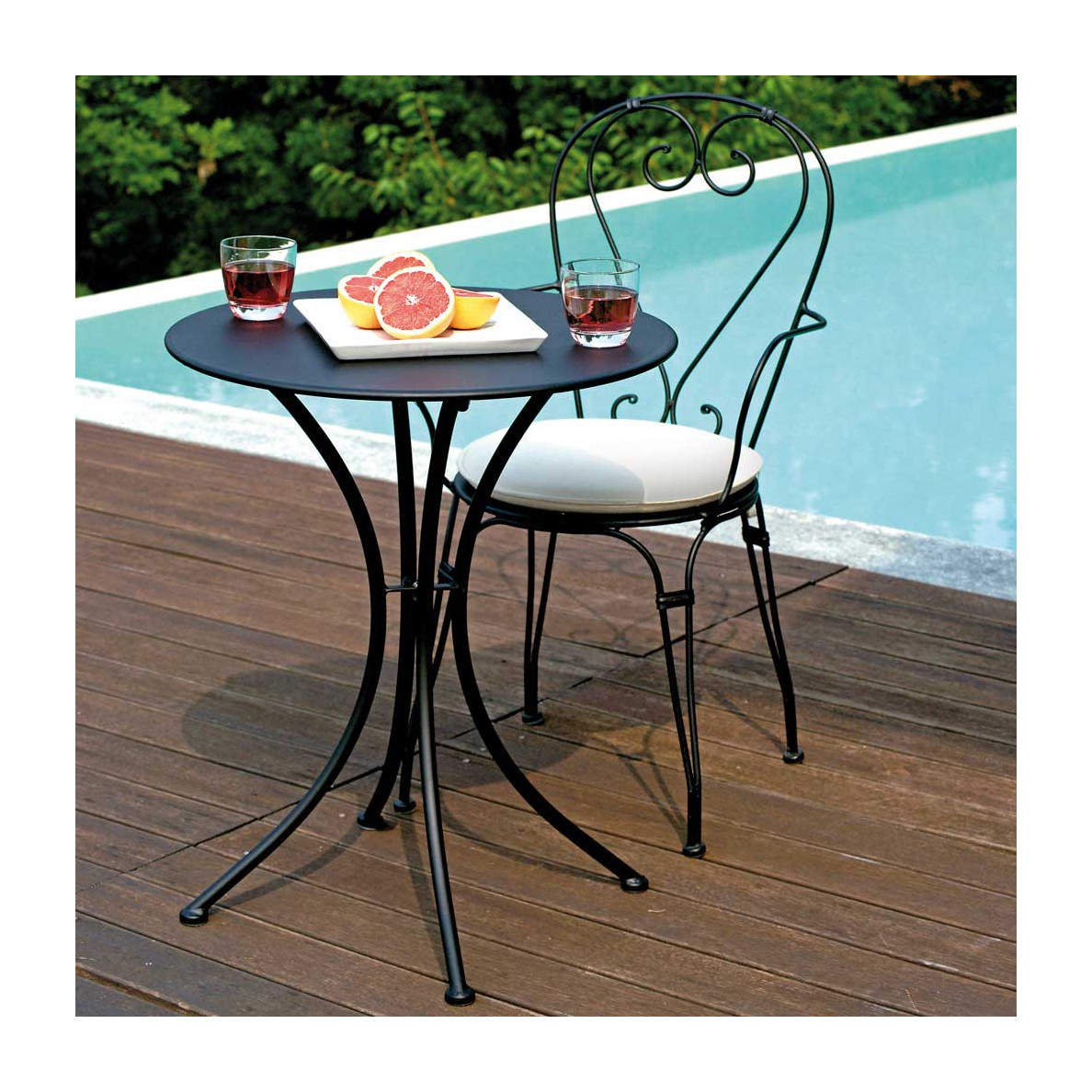Stresa è la sedia da giardino by Greenwood realizzata con struttura in ferro tinto nero con trattamento antiruggine e romantica decorazione retrò a motivi curvilinei. Sedile sagomato con traforatura per lo scolo dell'acqua.