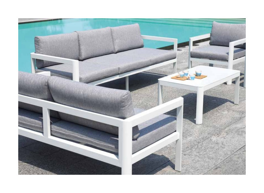 I cuscini di seduta e schienale sono anch'essi caratterizzati da una forma squadrata che completa la linea della poltrona.? Tubolare di alluminio colore bianco semilucido.? Cuscino di seduta e schienale con imbottitura in poliuretano a densità differenziata ricoperto in tessuto da esterno.