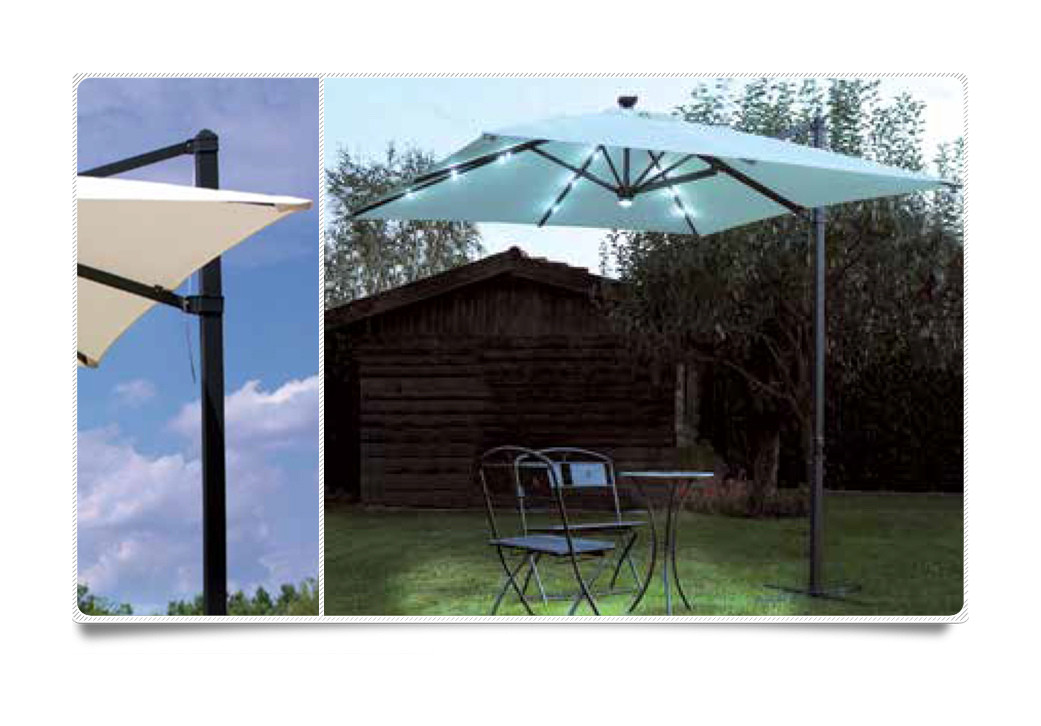La gamma di ombrelloni per esterno propone svariate soluzioni proposte in differenti misure: la nostra gamma è l'unica ad offrire questo elegante ed innovativo ombrellone da giardino con luci LED integrate.