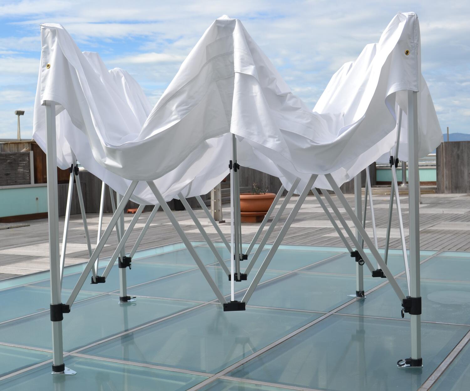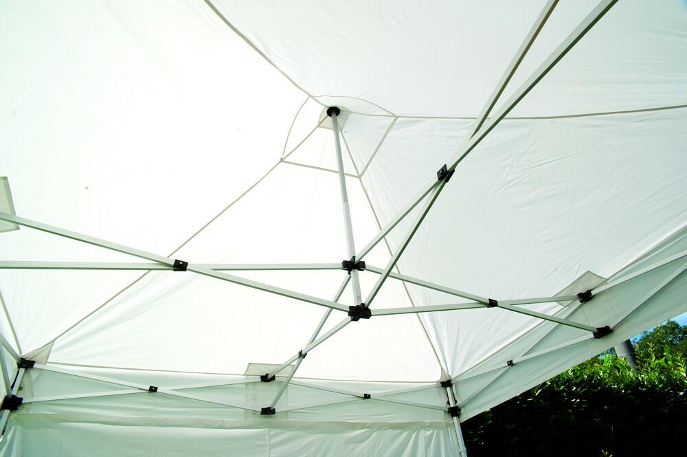 Gazebo con tetto apribile facilmente attraverso un sistema a compasso, che ne garantisce la stabilità e la pesantezza. Ideale per mercati, fiere, piccole esposizioni, sagre.