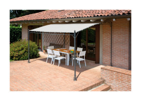 Il gazebo a pergola è, caratterizzato da una struttura in ferro verniciato cm 250x300 con telo idrorepellente in poliestere da 180g/mq, ideale per coprire un ampio spazio aperto.