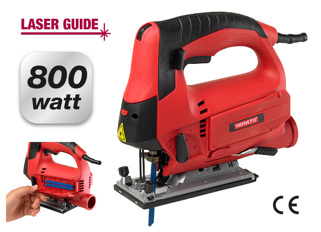 Caratteristiche: Guida laser - Base in alluminio con funzione di rilascio rapido - Attacco rapido lama - Velocità variabile - Funzione pendolo (4 posizioni) - Capacità di taglio 11 mm. legno, 10 mm. ferro - Dotazione: 6 lame stock sulla macchina