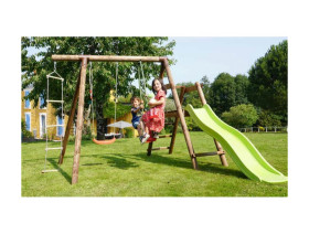 Pratica altalena doppia in legno + scivolo con onda centrale da 2,15 m + scala a fune da 1,90 m