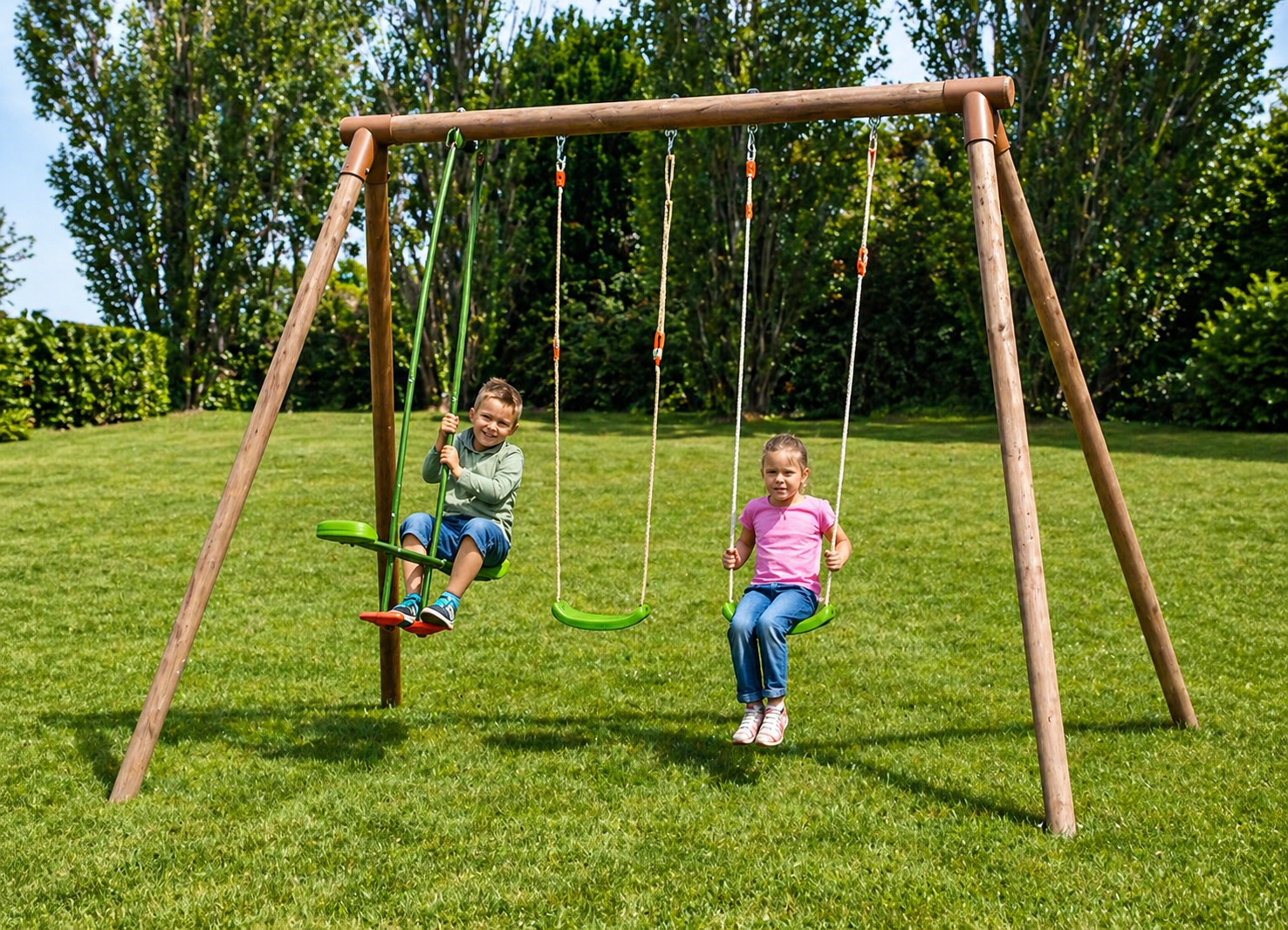 Un set giochi completo che combina divertimento e funzionalità: le altalene permettono il movimento dinamico, mentre il cavalluccio aggiunge una modalità di gioco diversa, più interattiva.