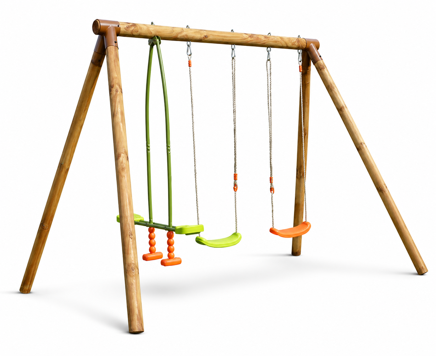 Porta nel tuo giardino un vero spazio gioco completo con il set NINFEA: una struttura solida e versatile composta da 2 altalene e 1 cavalluccio a dondolo, pensata per far divertire più bambini contemporaneamente in totale sicurezza.