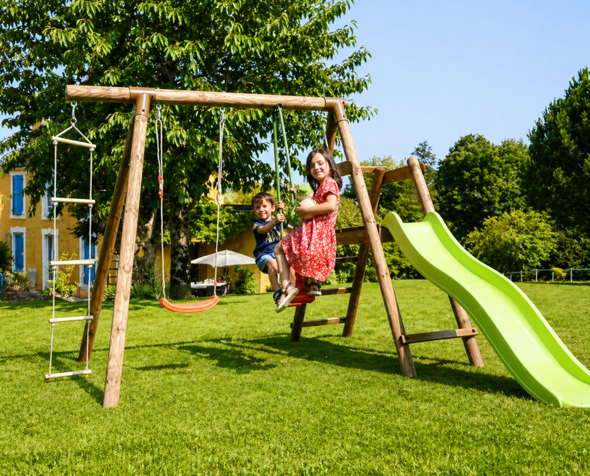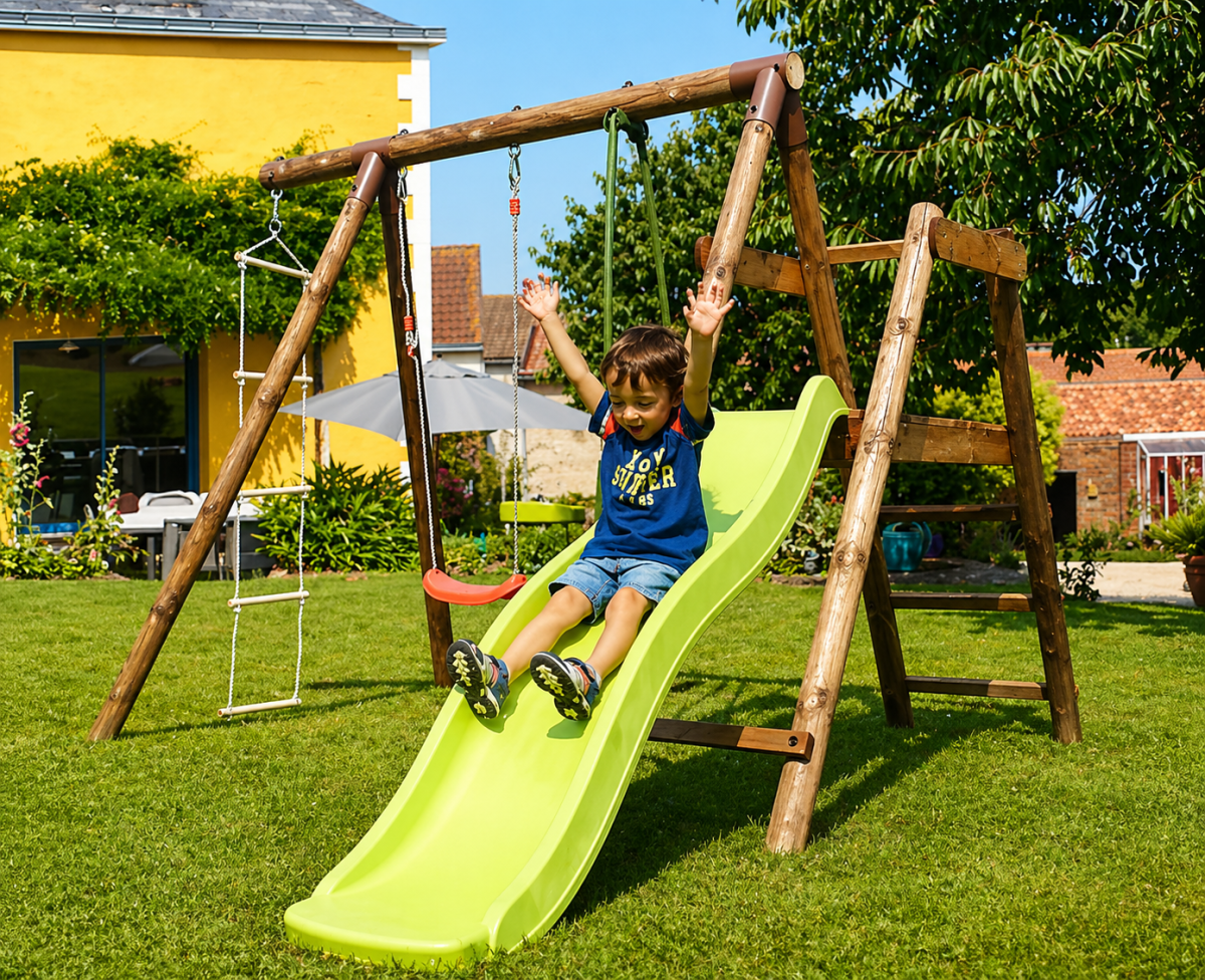 Un set progettato per offrire più esperienze di gioco in uno spazio ottimizzato: dallo scivolo per il divertimento immediato, all’altalena per il movimento, fino alla scala per sviluppare coordinazione.