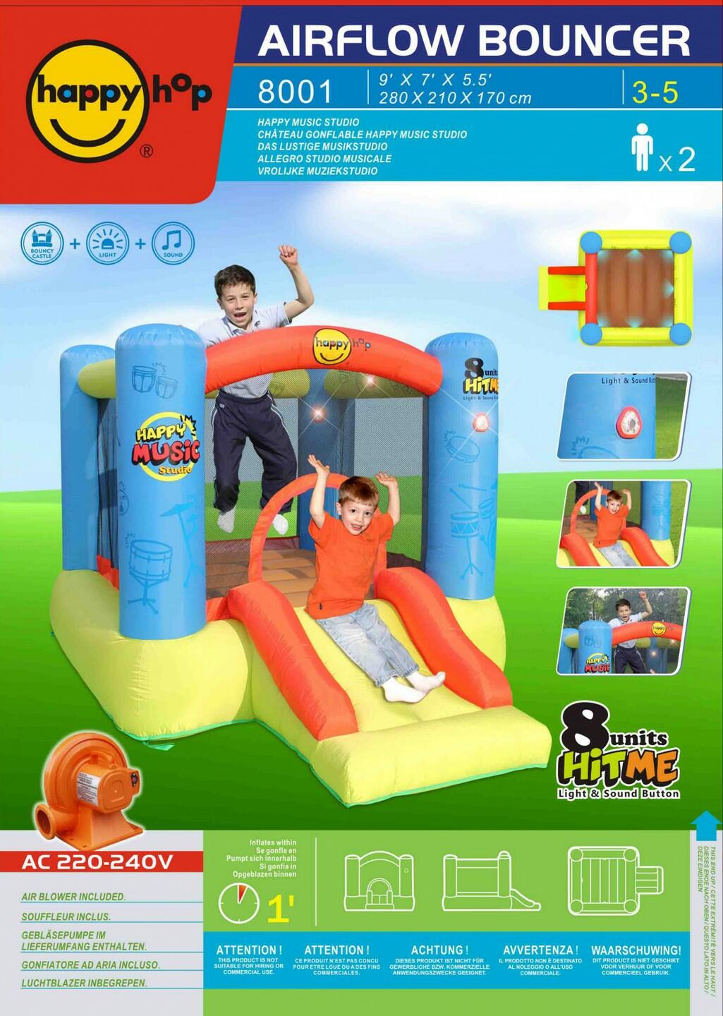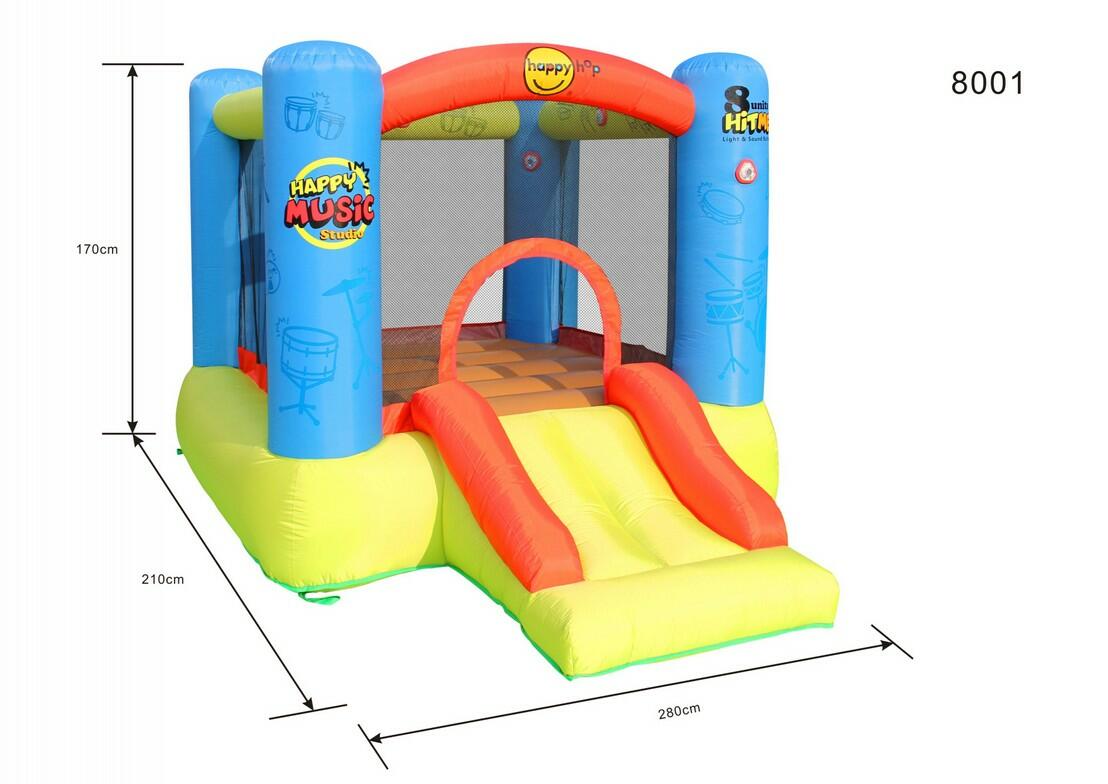 Happy Music Studio è il primo dei modelli della linea interattiva HITME di Happy HOP, mini gonfiabile con salterello e scivolino con questa grande innovazione perfetta per i bambini che possono divertirsi ancora di più saltando e scivolando a suon di musica e con effetti luminosi coloratissimi. Dotato di 8 pulsanti che si possono inserire negli appositi spazi distribuiti sul gonfiabile.
