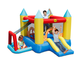 Area di gioco gonfiabile 4 in 1 per bambini, con funzioni trampolino e scivolo per il pieno di sensazioni. Dimensioni 300 x 280 x 210 cm. Installazione molto veloce (pochi minuti min) e senza sforzo (consegnato con soffiatore permanente). Massima sicurezza: reti laterali di protezione ? e sistema di ancoraggio al pavimento (4 punti). Fino a 3 giocatori simultanei.