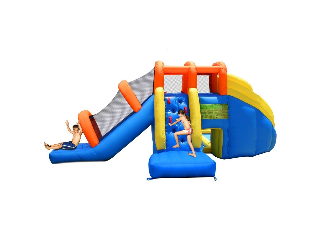Parco Acquatico Gonfiabile con tre scivoli lunghi, grande superficie per scivolare, ostacoli, tunnel, piscina, corridoi, parete per arrampicata, parete boxing, canestro, pioli per lancio anelli e tiro a segno (palline con velcro incluse). Superficie enorme ed extra robusta! Ideale per una festa o un evento, sarete sicuri di sorpendere grandi e bambini. Il gonfiatore rimane acceso durante tutto il periodo d'utilizzo dello scivolo. La struttura si gonfia molto velocemente in genere circa 2 minuti.