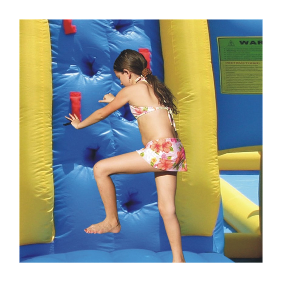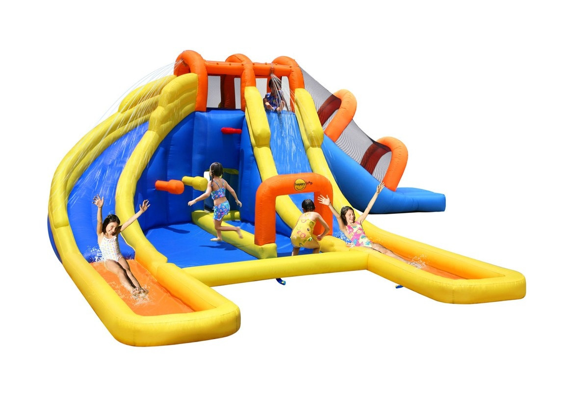 Il Castello gonfiabile Happy Hop "Parco Acquatico" dispone di tre scivoli lunghi, grande superficie per scivolare, ostacoli, tunnel da passare, piscina, corridoi, parete per arrampicata, parete boxing, tunnel, palla canestro, pioli per lancio anelli e tiro a segno (palline con velcro incluse). Il tutto su una vasta superficie, per poter organizzare anche diversi giochi di squadra.
